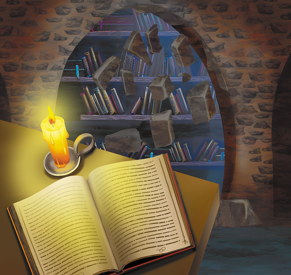 – Точно! Как же я сразу не подумала! – маленькая колдунья с досады шлёпнула себя по лбу. – А ведь верно! За стеной как раз такая древняя и секретная библиотека! Надо только отрыть проход, и я наверняка найду там нужную книжку или какой-нибудь словарь.