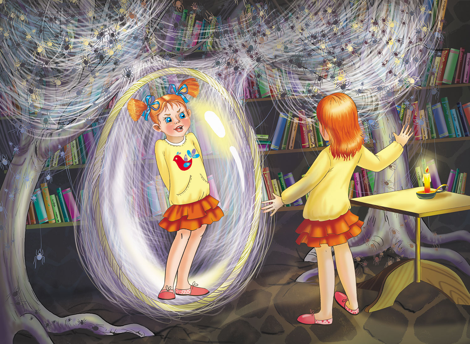 И тут из земли полезли два сухих корявых дерева, как две капли, похожие между собой. Едва их ветви коснулись потолка, как по стволам поползли пауки. Целое стадо пауков ползло и топало так, что деревья тряслись. Варя никогда не видела так много пауков, она даже отшатнулась, хотя ни капельки их не боялась. Пауки принялись вить паутину и очень быстро оплели ею оба дерева и пространство между ними. В самом центре плотного полотна из паутиных ниток сверкнула капля. Она стала расти и наполняться, сделалась большой, во весь Варин рост, и замерла, будто стеклянная. Больше ничего не происходило.