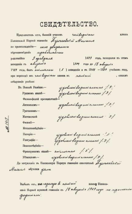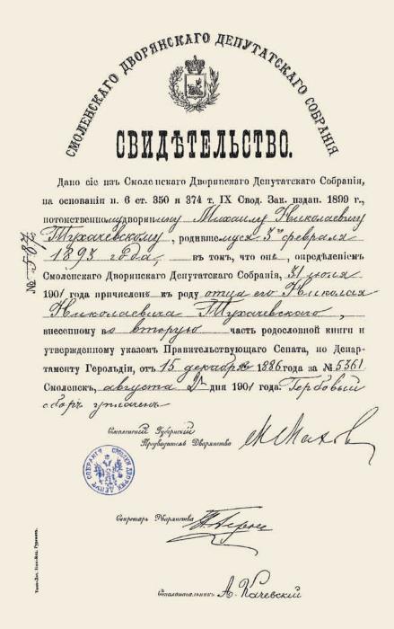 Смоленский Окружный Суд, в силу состоявшегося 23 августа 1896 года определения и на основании представленных в Окружный Суд документов, выдал сие свидетельство Потомственному дворянину Михаилу Николаевичу Тухачевскому… что он родился 3 февраля тысяча восемьсот девяносто третьего года, родители его: Потомственный дворянин Николай Николаевич Тухачевский и законная жена его Мавра Петровна, вероисповедания оба православного, первобрачные… 3 марта 1912 года22.