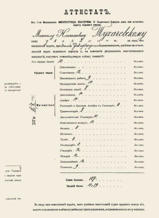 В 1912 году отмечалось 100-летие Отечественной войны 1812 года. «Отечественная война и ее герои» стали темой выпускного сочинения кадетов. В качестве пособия рекомендовалась «Война и мир» Л. Толстого. Экскурсия на Бородинское поле была проведена в условиях походной жизни, с применением разведки, сигнализации и с использованием полевой кухни. В корпусе Тухачевский составил словарик военноисторических событий по русской истории и в этой же тетради записал меткие пословицы и поговорки: «Бой отвагу любит», «Смелый приступ – половина победы», «Крепка рать воеводой», «Умей быть солдатом, чтобы быть генералом». 1 июня 1912 года Тухачевский получил аттестат об окончании кадетского корпуса20 и высшее для выпускника корпуса звание вице-фельдфебеля. Его аттестат был одним из лучших: средний балл 10,39 из 12 возможных. Максимальные оценки – 12 баллов – Тухачевский получил по словесности, географии, истории и законоведению. 11 – по алгебре и геометрии, химии, физике, космографии21. Ему предстояла дальнейшая учеба в привилегированном военном учебном заведении – Александровском училище. Тогда Тухачевскому снова напомнили о «подпорченной» родословной: возникла необходимость в документе, подтверждающем происхождение, с указанием принадлежности к потомственным дворянам: