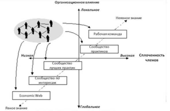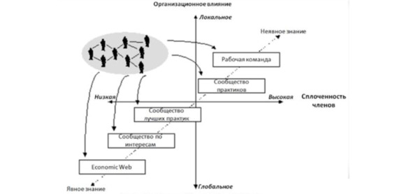 При высоком уровне структурности и формализации знаний/ практик на организационном (глобальном) уровне при низкой сплоченности взаимодействующих сотрудников возникает потребность в организационной ИТ-платформе, соединяющей все типы участников сообществ и сотрудников, которые пока не участвуют или участвуют редко в деятельности внутрикорпоративных сообществ. Такая платформа является стратегическим инструментом и реализуется на этапах существенной зрелости бизнес-процессов в компании и необходимости быстро решать существующие задачи по алгоритму и быстро отвечать на новые вызовы. Именно поэтому многие компании, ставящие себе задачу создать систему управления знаниями на ранних этапах организационной зрелости, терпят фиаско. В такие периоды жизнеспособны только локальные проекты, так как любые системные организационные решения требуют участия не просто лояльных сотрудников, а подходящей к решению задачи устойчивой структуры человеческих взаимодействий, а это организовать очень непросто. Поэтому практики внутрикорпоративных сообществ весьма привлекательны, так как способны демонстрировать эффективность, продуктивность, не высокие затраты и существенную полезу для человеческих отношений и культуры взаимодействий внутри и вокруг организации.