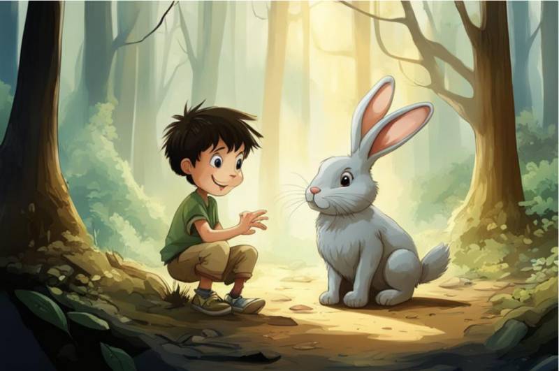 Но мальчик не послушался родителей и отправился в лес один. Там Витя встретил веселого зайчонка по имени Пушистик.