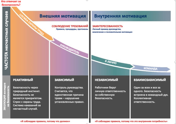 На многих предприятиях мира кинулись развивать компетенции приоритета безопасности прежде всего высшего руководства. Высшее руководство стало создавать миссии с включением формулировок культуры безопасности. Но вы же понимаете, что этого недостаточно.