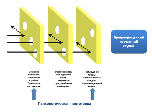 То есть смысл последовательно выставленных заслонов находится в том, что наступление несчастного случая возможно только при наложении несоответствий («дыр» в системе безопасности труда) на разных ее уровнях. Причем, психологический инструментарий вшит в два заслона из трех: