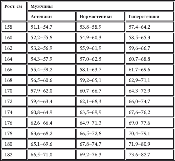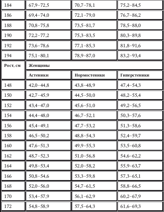 Итак, сначала давайте выясним, имеется ли у вас избыточный вес. Для этой цели было разработано множество систем и формул, однако современные диетологи предпочитают таблицу Егорова – Левицкого, согласно которой нормальный вес мужчин и женщин определяется с учетом их типа телосложения (табл. 1.1).