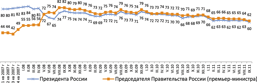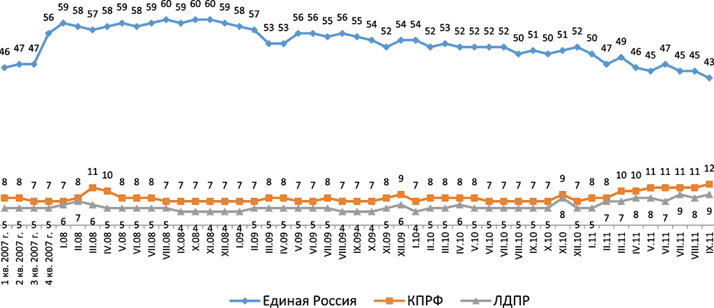Тенденция к снижению рейтинга «Единой России» приобрела устойчивый характер в 2010 г. и развилась в 2011 г. Такая ситуация создала негативную рамку кампании и определяла стратегию поведения участия в ней представителей власти. Со стороны «Единой России» было бы вполне обоснованным предложение инновационной по содержанию кампании, но она, как обычно, пыталась работать в режиме «партии хватай всех» (catch-them-all party). Хотя запрос на перемены был отчетливо выражен, он оказался нереализованным партией власти. Значительный вклад в провал кампании «Единой России» внесло также несвоевременное (явно запоздавшее) решение о «смене коней на переправе» (замене в роли лидера партии В. Путина на Д. Медведева).