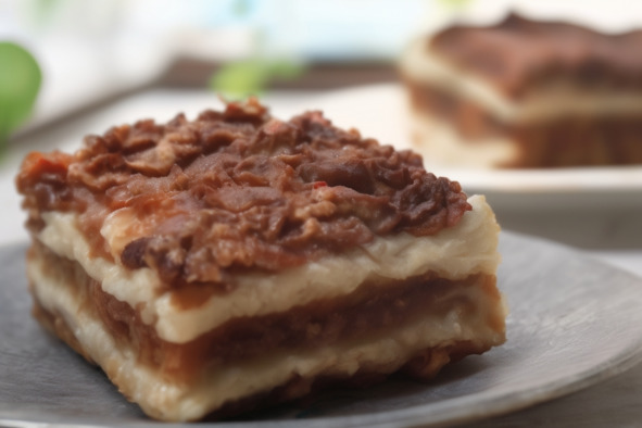 Сборка пирога: Вылейте половину теста в подготовленную форму, равномерно распределите его по дну. На тесто равномерно выложите начинку из красной фасоли, оставляя небольшие края без начинки. Затем аккуратно вылейте оставшееся тесто поверх начинки, чтобы полностью её закрыть. Сверху выложите ещё один слой фасоли. При желании, вы можете сделать больше слоёв.