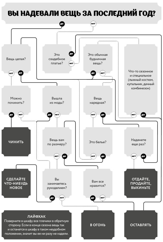 Самая простая сортировка нужна для того, чтобы выявить неудачников. Тех, с кем вы дружить больше не хотите. Если сомневаетесь, смело отправляйте вещь в кучу «не знаю». Пусть эта куча будет самой большой и многообразной. Пусть вы займетесь ею потом, вы можете пересмотреть вещи еще несколько раз. Настоящая задача этого этапа – отбраковать то, что больше мы не будем рассматривать в вашем гардеробе.