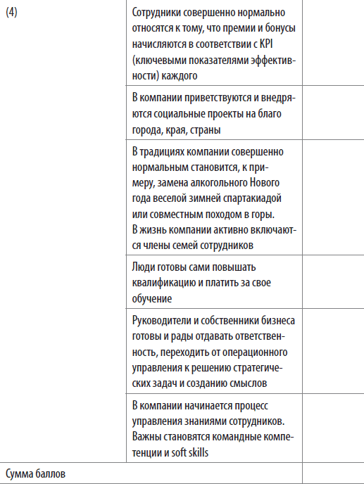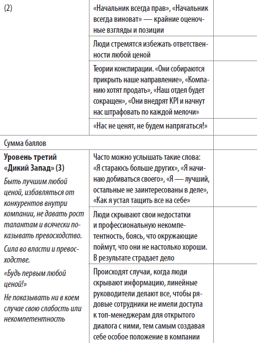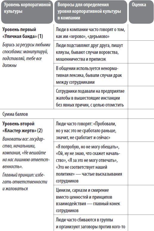 (1) Сумма баллов: более 10. Если у вас есть определенное количество баллов в этом разделе, обязательно определите, кто из сотрудников создает корпоративную культуру первого уровня по типу «Уличная банда». Избавляйтесь от таких сотрудников, какую бы должность они ни занимали. Вы не исправительное учреждение, и в задачи бизнеса не входит перевоспитание таких людей.