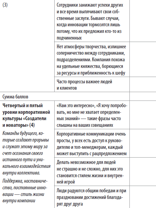 В этой главе рассказывается об интересном подходе к оценке уровня корпоративной культуры в компании, а также о пяти уровнях корпоративной культуры.