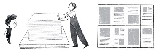 В типографии бумага для книг хранится в огромных рулонах. Их разматывают и нарезают на большие листы, которые называют печатными. На одном печатном листе помещается 4, 8, 16 или 32 страницы будущей книги.