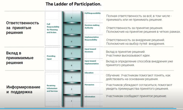 Проводить ретроспективу можно в компаниях с различной корпоративной культурой, но нужно понимать особенности. Хочу познакомить вас с концепцией «лестницы вовлеченности». На этом примере мы можем увидеть, каким образом в различных корпоративных культурах принимаются решения. В некоторых командах, особенно крупных компаниях, все ключевые стратегические направления определяются «сверху вниз». Задача линейного руководства – ознакомить с этой стратегией своих подчиненных. Когда вы проводите ретроспективу в такой команде, все обсуждаемые решения должны быть синхронизированы с глобальной стратегией компании: нет смысла обсуждать идеи, которые из нее выбиваются, они не будут реализованы.