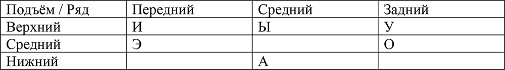 Под «местом образования» гласного звука понимается положение языка при произнесении этого звука: наиболее поднятая часть языка может оказаться напротив передней, средней или задней части нёба. Таким образом, по месту образования различают гласные переднего ряда [и], [э], среднего ряда [а, ы] и заднего ряда [о, у].