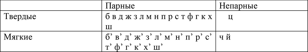 Различают твердые и мягкие согласные. Они так же могут образовывать пары по твердости / мягкости, но некоторые звуки пары по этому признаку не имеют.