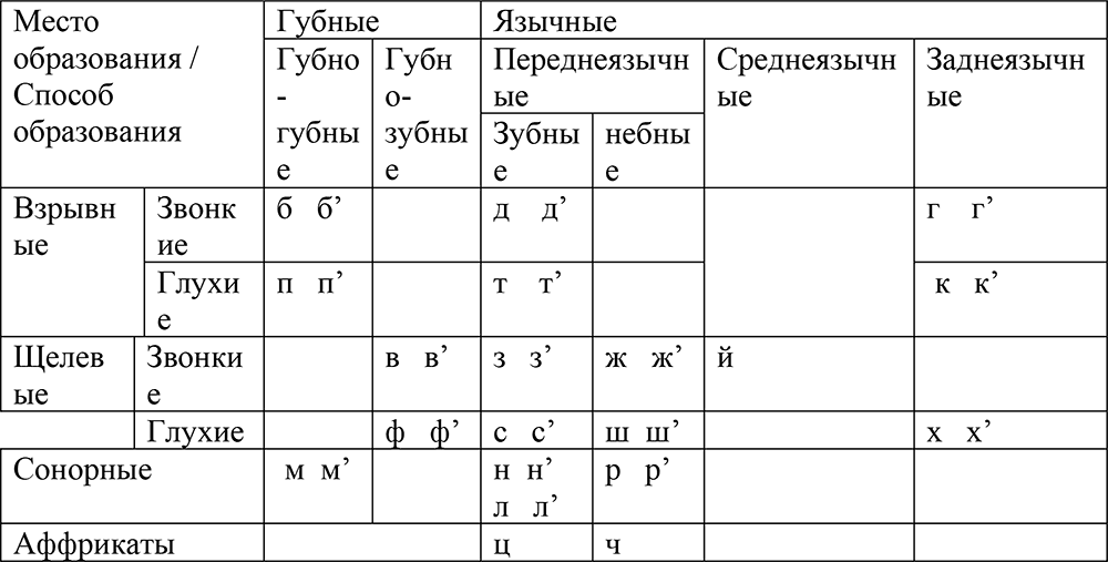 Отдельные категории согласных звуков имеют также свои названия в зависимости от места и способа образования шума. В зависимости от того, какой активный орган речи, нижняя губа или язык, задействован в образовании звука, согласные делятся на губные и язычные. В зависимости от способа образования шума (мгновенного и длительного) согласные делятся на взрывные (смычные) и щелевые (фрикативные).
