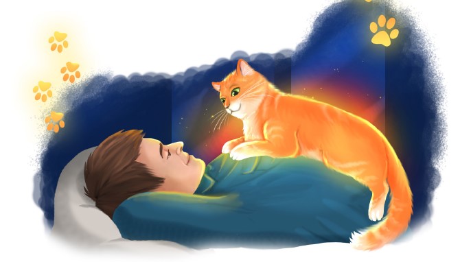 За сном охотится мой кот,Он видит больше, чем другие:Как ангел за окном идёт,Как нимбы светят золотые,Как призраки летят сквозь дверь,Как прошлое за стол садится.Кот видит время без потерьИ сном на грудь мою ложится.Сергей Бородин