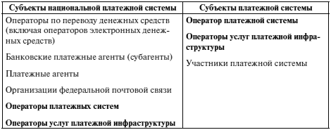 Следует обратить внимание, что в комментируемом Законе используется также самостоятельное понятие «платежная система», не тождественное понятию «национальная платежная система» (см. п. 20 комментируемой статьи). Для сравнения данных понятий в зависимости от их субъектного состава предлагается следующая таблица (жирным шрифтом выделены субъекты, присутствующие в обоих определениях).