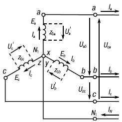 Фазные напряжения источника отличаются от его ЭДС вследствие падений напряжения во внутренних сопротивлениях источника, а напряжения приемника отличаются от напряжений источника за счет падений напряжения в сопротивлениях проводов электрической сети. Пока же для упрощения анализа соотношений в трехфазных цепях будем пренебрегать указанными падениями напряжения.