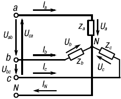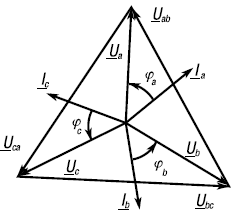 Линейные напряжения направляют следующим образом: напряжение Uab – от a к b, Ubc – от b к c, Uca – от c к a. Линейные токи во всех линейных проводах направляют к приемникам.