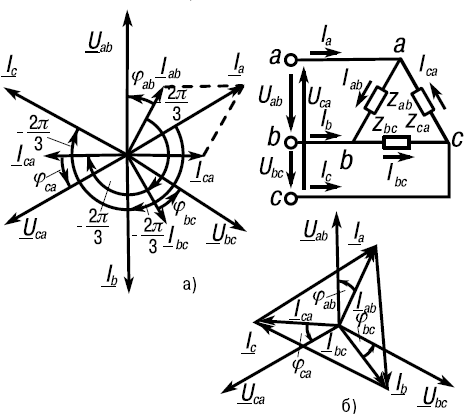 Как видно из схемы, каждая фаза приемника при соединении треугольником подключена к двум линейным проводам. Поэтому независимо от значения и характера сопротивлений приемника каждое фазное напряжение равно соответствующему линейному напряжению: Uф = Uл.