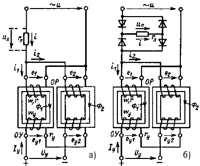 Магнитный усилитель (МУ) состоит из двух ферромагнитных магнитопроводов, на каждом из которых расположены рабочая обмотка ОР и обмотка управления ОУ. Для уменьшения потерь мощности магнитопроводы изготовляют из отдельных стальных листов. В некоторых случаях применяют ферритовые магнитопроводы. Рабочие обмотки соединяют, как показано на рисунке, параллельно либо последовательно и подключают к источнику переменного тока.