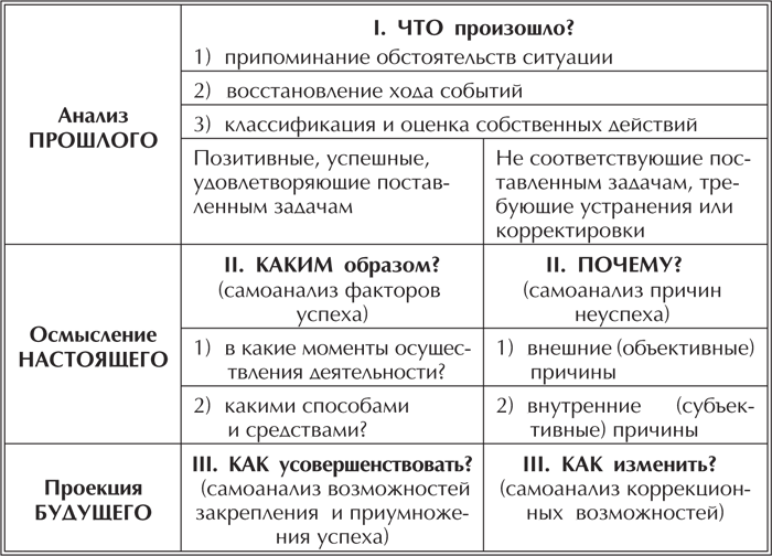 Процесс рефлексии можно представить в виде алгоритма, раскрывающего последовательность умственных действий. Человек задает самому себе вопросы и сам же пытается на них ответить.