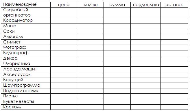 Ниже, будет приведен пример свадебной сметы, которую вы можете откорректировать под свои потребности.