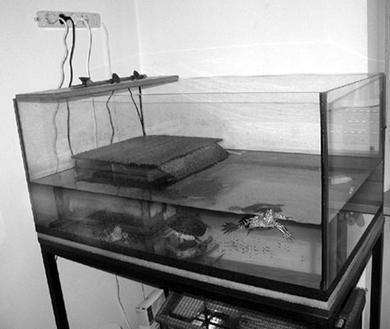 Сухопутных черепах следует содержать в террариуме, на дно которого насыпан крупнозернистый песок слоем 3–5 см, температура воздуха должна быть 22–24 °C, а для тропических видов – 25–27 °C. Для водных видов черепах чаще всего используют акватеррариумы объемом около 200 л, с островком, на который черепахи могли бы выходить.