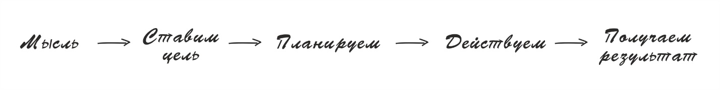 Из того, что показано на рисунке 1 мы видим: приходит мысль, мы ставим под нее цель, затем начинаем планировать наши действия, далее действуем по намеченному плану и в конце получаем результат. Если мы проходим все этапы до конца, то наш результат неизбежен. Если вы не добились результата, значит вы либо еще на пути, либо где-то сбились.