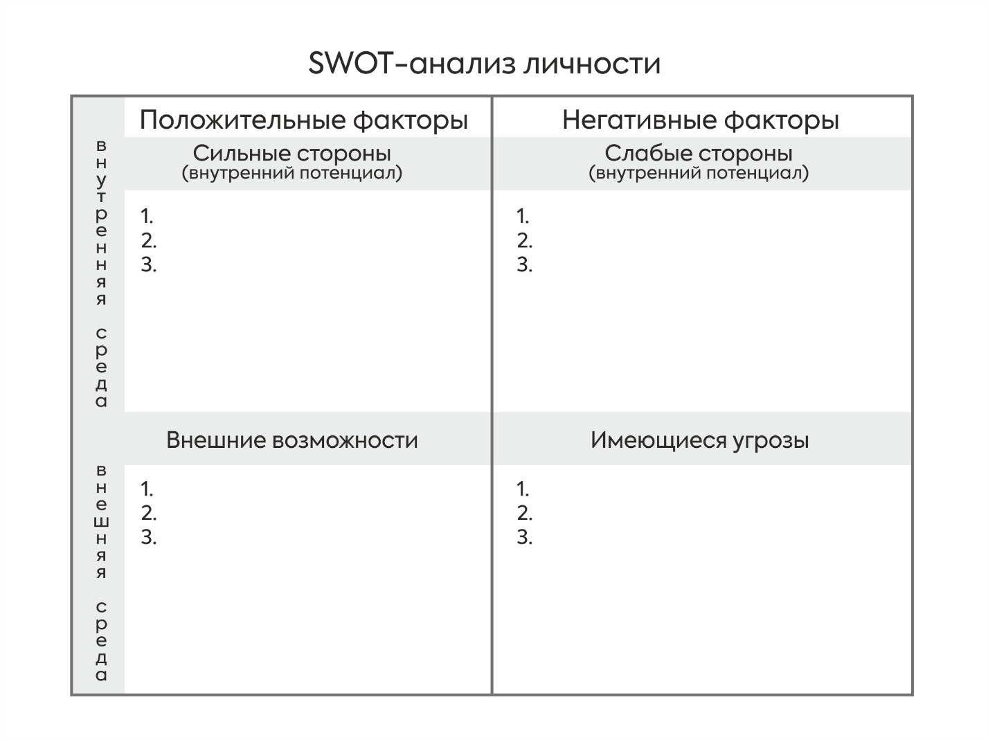SWOT-анализ применяется не только в деятельности предприятий и бизнесе, но также может применяться в любой другой сфере. Вы можете провести SWOT-анализ личности. Или провести SWOT-анализ любой масштабной и амбициозной цели.