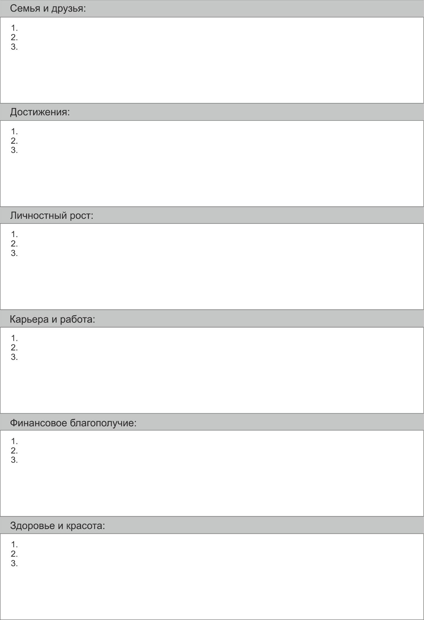 Также наши цели могут делиться на подкатегории: семья и друзья, работа и карьера, личностный рост, достижения, финансовый рост, здоровье.