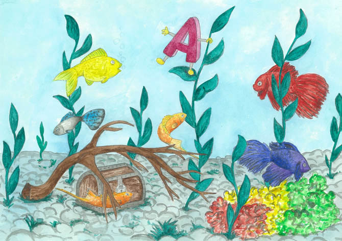 Буква А от радости захлопала в ладоши и чуть не упала с водоросли. Женя аккуратно поймал её и посадил на стол. Из рюкзака он достал букварь, в который с удовольствием прыгнула буква А, а Женя и Стелла пошли к аквариуму наблюдать, как рыбки заселяют свой новый дом.
