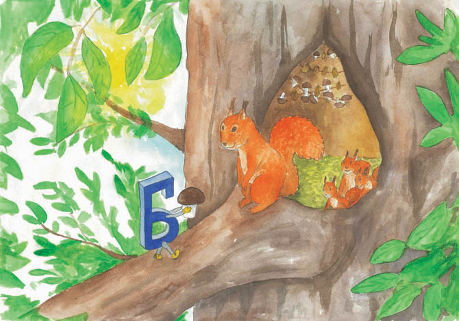 Вскоре Женя вернулся с рюкзаком, полным грибов. Потом набрал два рюкзака ягод и три рюкзака орехов. Мальчик складывал запасы под деревом, а мама-белочка с бельчатами носили их в кладовую. Когда подняли последний гриб, буква Б сказала: