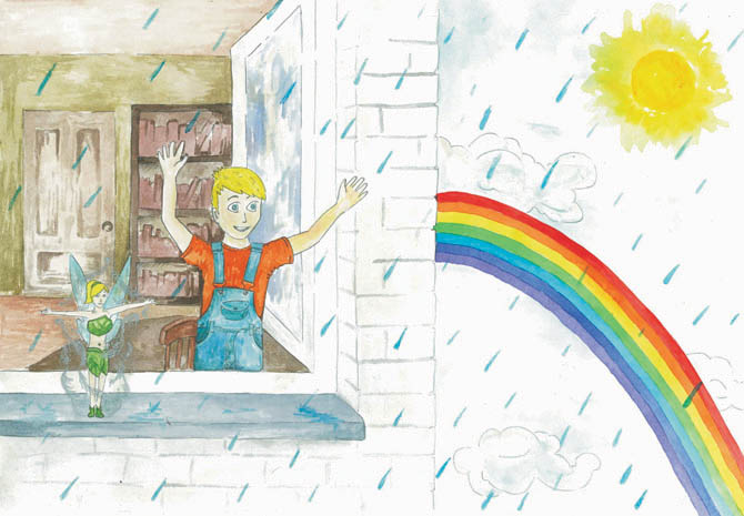 На ясном солнечном небе стали появляться первые тучки. Их становилось всё больше и больше. Спустя несколько минут пошёл дождь. Он весело барабанил по крышам, выстукивая мотивы детских песен. Деревья, цветы и трава жадно пили долгожданную влагу. Через всё небо распростерлась разноцветная радуга. Люди, животные и птицы смотрели на неё и радовались дождю.