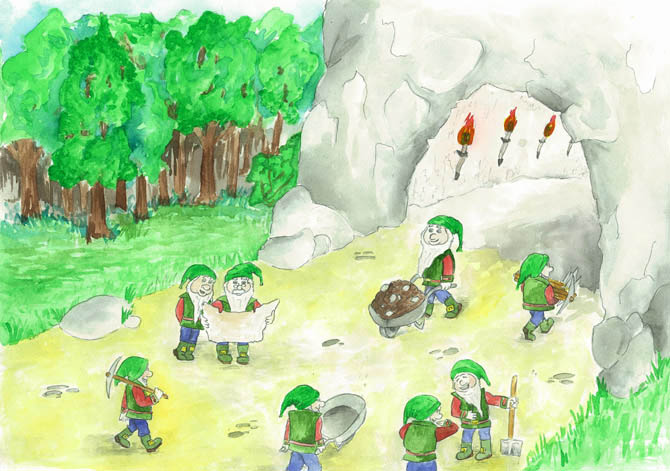 Тут было огромное количество гномов, и все они занимались важной работой. Неподалёку стояла буква Г и громко считала. На "раз" гномы поднимали свои кирки, на "два" опускали их и откалывали большие куски породы.