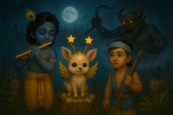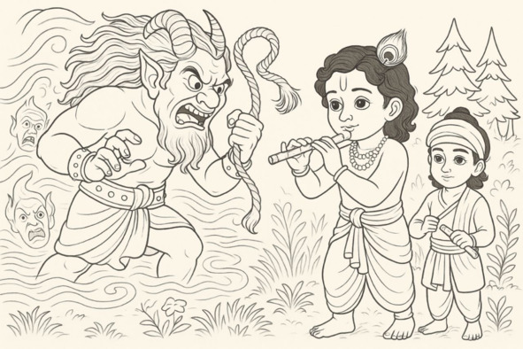 Они встречают демона Хлыстуна, который пугает зверей своими голосами. Кришна играет на флейте, и звук его мелодии рассеивает страх.