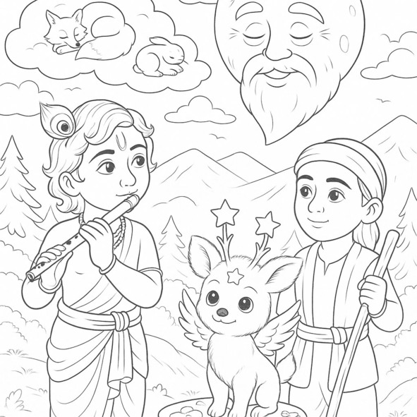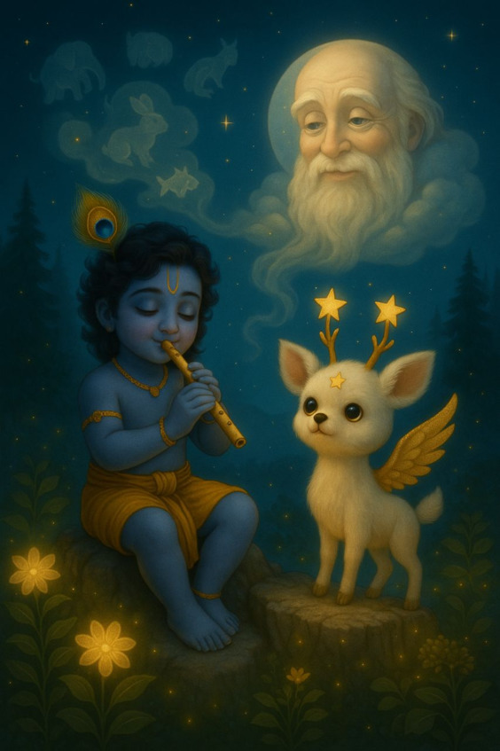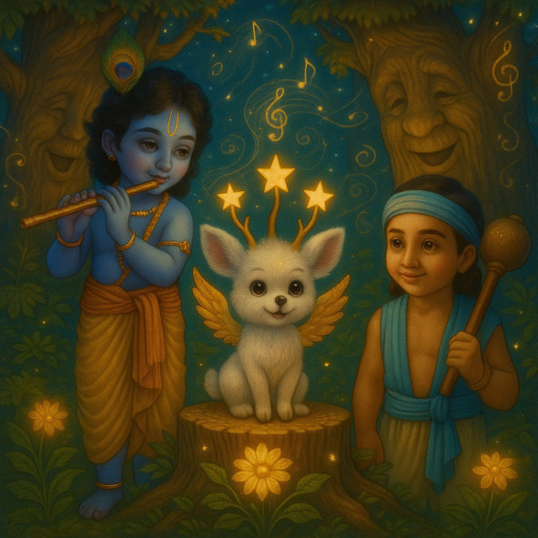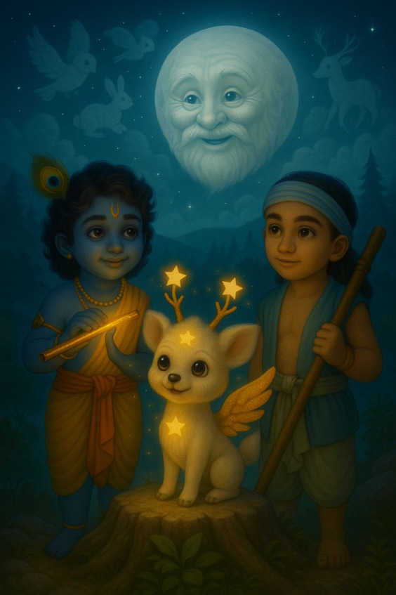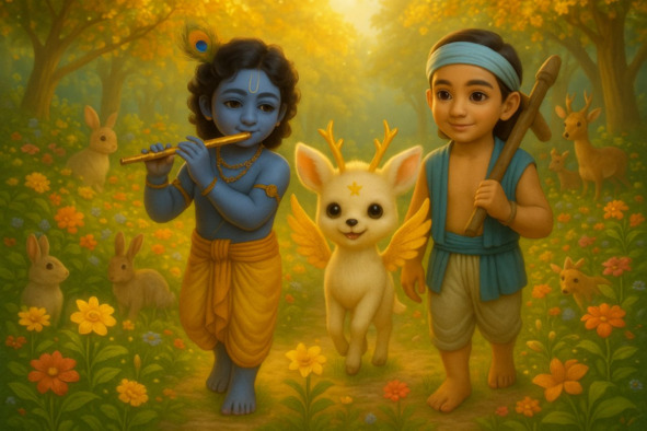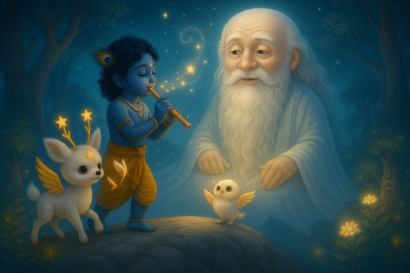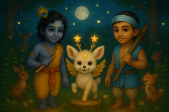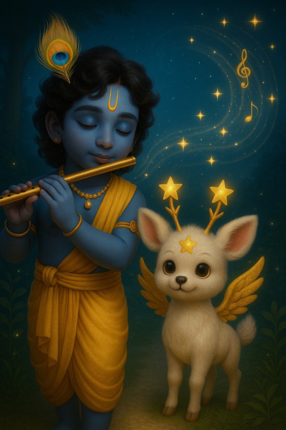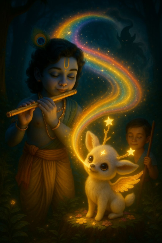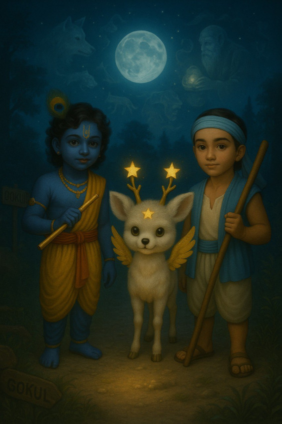 Твиша, Кришна и Баларама возвращаются в Гокул. В лесу теперь мир, звери танцуют, а в небе поют звёзды.