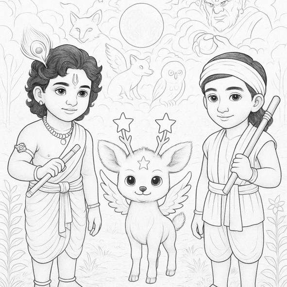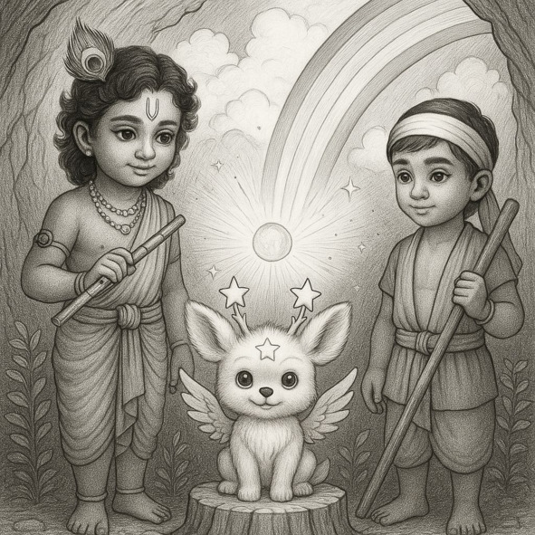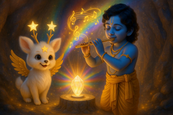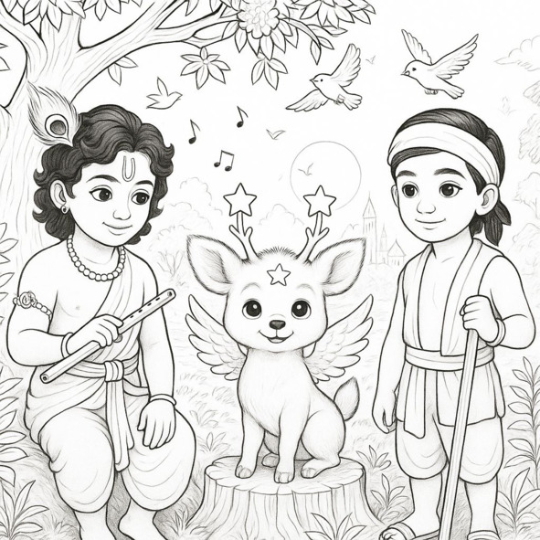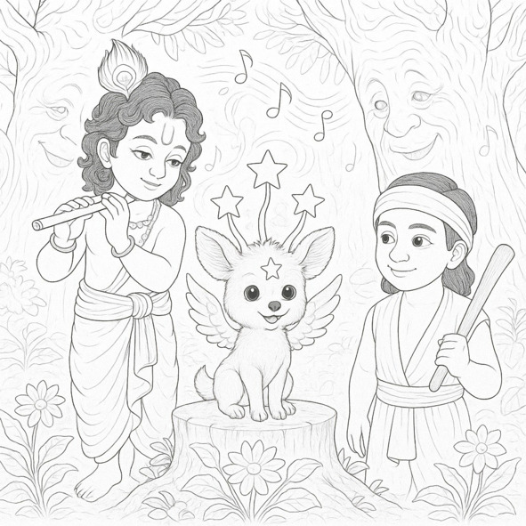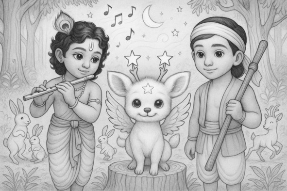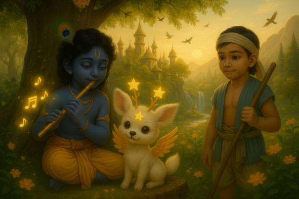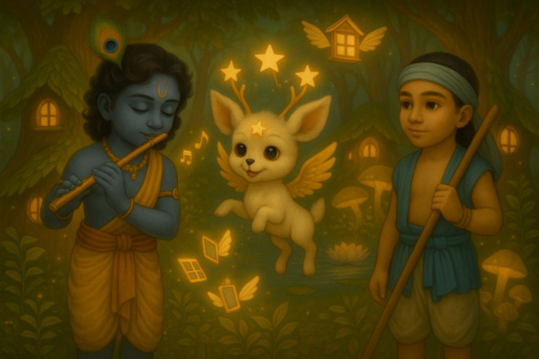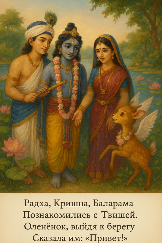 Однажды Кришна, Баларама и Твиша сидели под деревом Кадамба в Лесу Духов. Вокруг пели птицы, ветер трепал флейтовые ноты, и вдруг Твиша сказала: – А что, если мы построим город? Город, где никто не будет бояться, где дети будут смеяться, цветы говорить, а реки петь?
