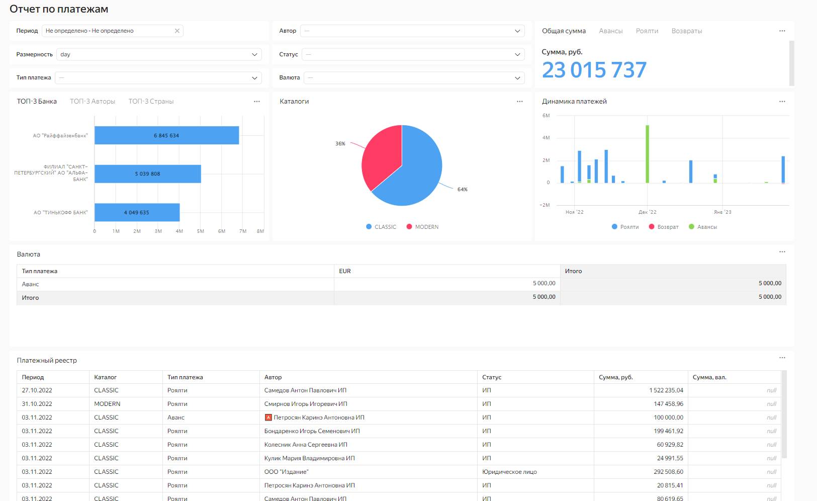 Представим, что у нас имеется небольшая компания, выплачивающая роялти авторам книг, которая ведет свой учет в 1С. 1С, несмотря на свой богатый функционал, все же не обладает развернутыми аналитическими инструментами, позволяющими всесторонне проанализировать выплаты. Однако менеджмент компании хочет наглядно и доступно видеть расширенную информацию о платежах. Например, быстро и просто увидеть, сколько роялти было выплачено, а сколько авансов, с какими банками чаще всего приходится взаимодействовать, в какие страны чаще всего совершаются платежи и в какой валюте. Вся эта информация поможет бизнесу оптимизировать и улучшить денежные поток, тем самым, уменьшив расходы и высвободив ресурсы для других задач.