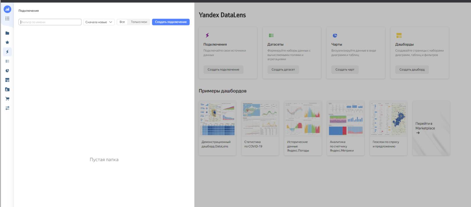 Что начать пользоваться DataLens достаточно иметь учетную запись Yandex. Данный сервис автоматически станет доступен для использования.