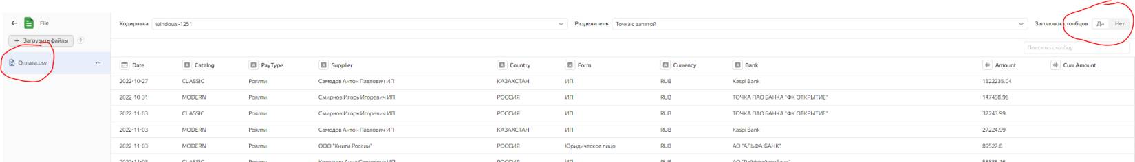 Если все сделано верно, то в рабочей области появится предварительный просмотр полей файла. Тут следует проверить, что заголовки в таблице используются также в качестве заголовков и тут. Это видно справа вверху. Также на всякий случай следует проверить, что типы данных в колонках соответствуют нужным. Например, что число – это число, а текстовое поле – это текст.