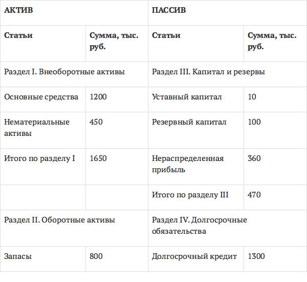Бухгалтерский баланс представляет собой двустороннюю таблицу, левая сторона которой содержит имущество предприятия и называется «Актив», правая сторона содержит источники средств и называется «Пассив». Итоговая строка называется «валюта баланса».