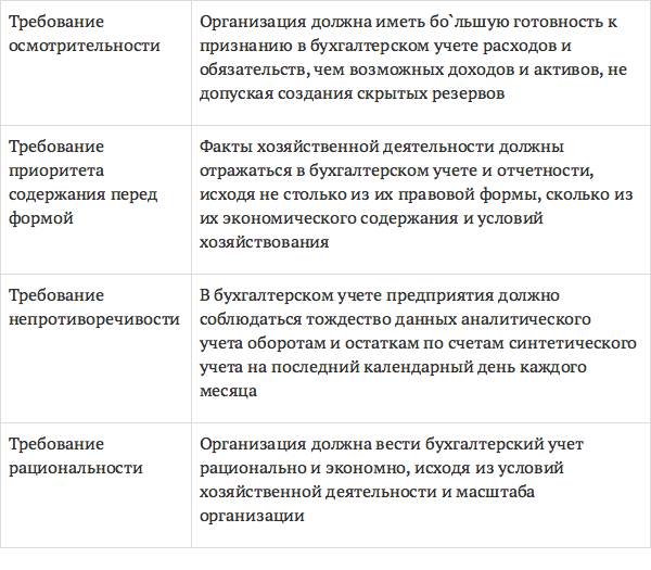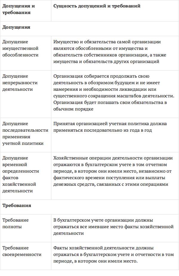 Принятая организацией учетная политика должна удовлетворять следующим допущениям и требованиям, представленным в табл. 1.