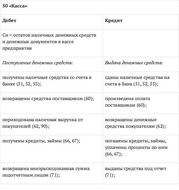 Для учета движения наличных денежных средств организации используется активный счет 50 «Касса». Сальдо счета показывает сумму наличных денежных средств и денежных документов в кассе предприятия. По дебету счета отражается поступление наличных денежных средств в кассу предприятия. По кредиту счета отражаются суммы, выданные наличными из кассы организации.