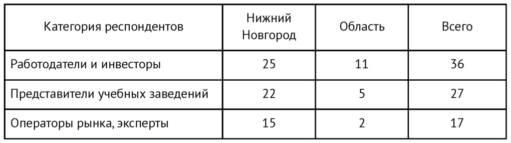 Для работодателей и инвесторов был выбран метод экспертных социологических интервью. В качестве работодателей привлекались либо собственники и менеджеры предприятий, учреждений, компаний, либо руководители их кадровых подразделений. Вместе с ними интервьюировались еще две группы: представители образовательных институтов (среднеобразовательные школы, средние профессиональные учебные заведения, высшие учебные заведения) и операторы рынка труда (органы управления, кадровые агентства, корпоративные объединения, эксперты-консультанты). Некоторые респонденты совмещали заданные для выборки характеристики. Всего было проинтервьюировано, согласно плана, 80 респондентов. Интервьюирование проводилось в декабре 2008 – первой половине января 2009 гг. Велась аудиозапись интервью, в дальнейшем все они были подвергнуты транскрибированию и контент-анализу.