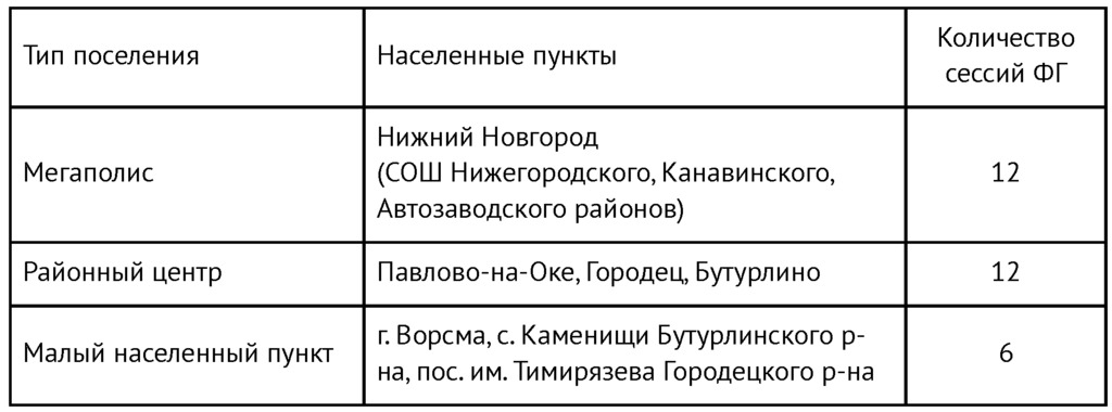 При подходе к изучению представлений учащихся выпускных классов средних школ и их родителей было учтено то обстоятельство, что именно в период проведения наших полевых исследований, за несколько месяцев до окончания школы, семьи старшеклассников живо и заинтересованно обсуждают все вопросы, связанные с предстоящим им их первым жизненным выбором. И было интересно воспользоваться этой ситуацией, чтобы изучить процесс принятия решения в момент кульминации, а не его результаты постфактум. С этой целью была избрана методика фокусных групп с парными аудиториями: для одной сессии рекрутировались старшеклассники, для следующей – их же родители (один из двоих). Такой подход позволил получить содержательные «стереоскопические» данные, отразившие мысли, чувства и намерения обоих основных субъектов, участвующих в самоопределении, но получивших возможность высказаться автономно. При выборке учитывались место жительства (учёбы), пол, уровень образования респондентов. Проводилась видео– и аудиозапись дискуссий, в дальнейшем было осуществлено транскрибирование и контент-анализ текстов. Всего было проведено 30 сессий фокусных групп (соответственно по 15 с детьми и родителями). Фокусные группы были проведены в период с 17.01. по 08.02.2009 г. в нижеуказанных населенных пунктах Нижегородской области.