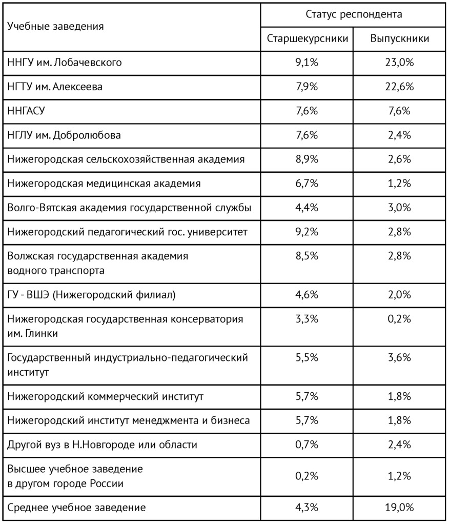 Всего было опрошено 1.023 респондентов в г. Нижнем Новгороде. (География исследования была ограничена областным центром, поскольку здесь обучаются и трудоустраиваются далеко не только нижегородцы, но также жители населенных пунктов области и других регионов; Нижний Новгород – центр образовательного пространства и самый емкий рынок труда в регионе.). Полевая часть опроса проводилась 30.01 – 06.02.2009 года. Ниже приведён состав респондентов по учебным заведениям.