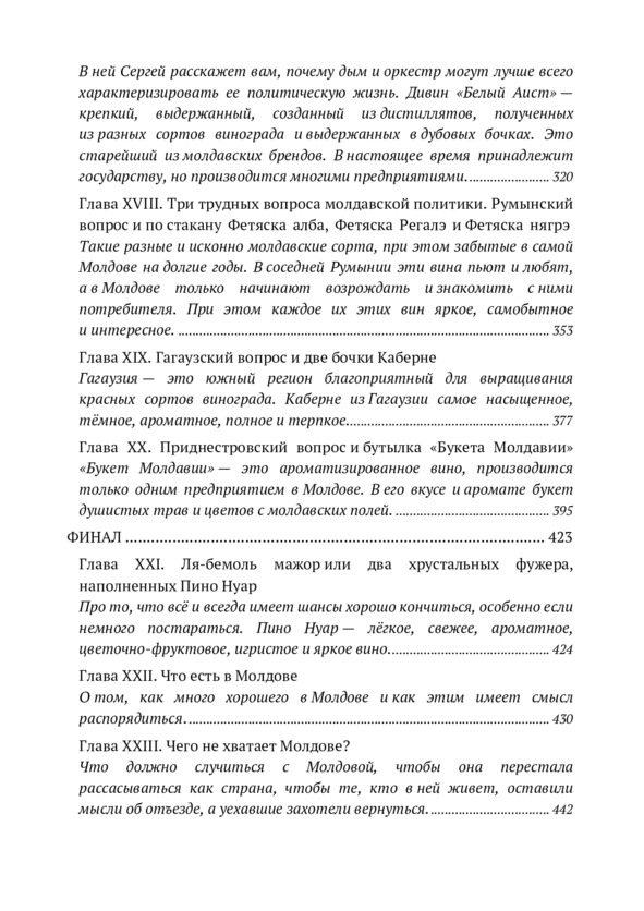 И еще кое-что важное. Молдова – винодельческая страна. Виноделие – это судьба, предназначение, поэзия, песня и душа Молдовы. Мы не могли обойти это вниманием и снабдили каждую главу дополнительным подзаголовком в виде сорта вина. Дело в том, что у молдавских вин есть не только вкус, цвет, запах, консистенция и крепость, у них есть характер, у них есть история, у них есть свой социальный капитал в виде культуры их пития. Мы хотели бы, чтобы наш читатель присовокупил к тексту все свои ассоциации с именем вина. Мы уверены, что в таком случае написанное нами будет полнее понято и легче принято им.