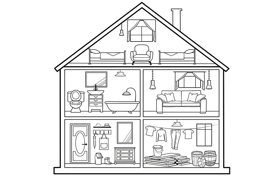 Вставьте пропущенную букву в слова, найдите эти слова в доме и раскрасьте их:
