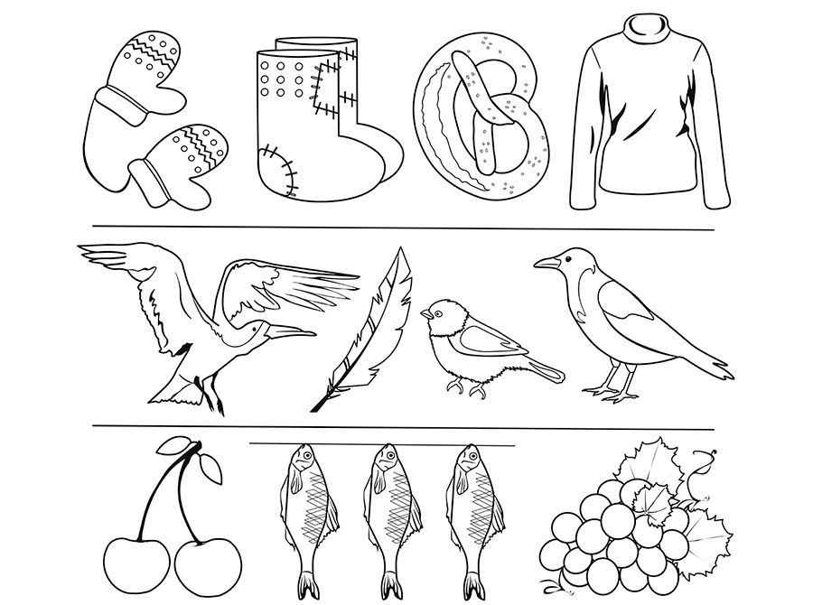 Найдите лишние картинки в каждом ряду и раскрасьте: